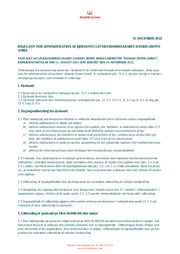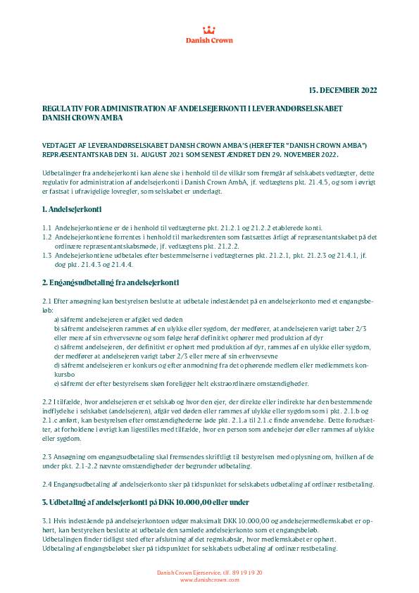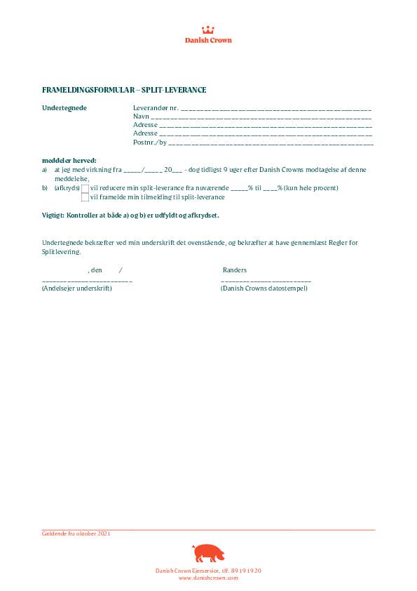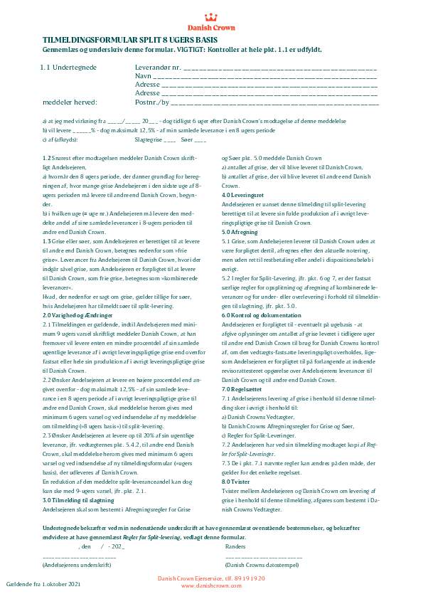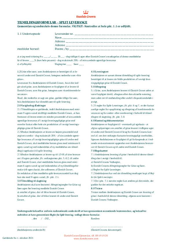 Articles Of Association Leverandørselskabet Danish Crown Amba (DK)0.66 MBDownloadCode Of Practice Danish Crown Grise Og Søer (DK)6.96 MBDownloadFrameldingsformular - splitleverance0.03 MBDownloadSelvkøreregler0.03 MBDownloadRegulativ for administration af andelsejerkonti0.06 MBDownloadRegulativ for administration af ejerkonti0.07 MBDownloadRegler for split-levering0.07 MBDownloadTilmeldingsformular - splitleverance - ugeleverancer0.07 MBDownloadTilmeldingsformular - splitleverance - 8 ugers leverance0.07 MBDownloadDanish Crown Forretningsbetingelser Til Værdikædeaftaler0.52 MBDownloadAfregningsregler0.18 MBDownload