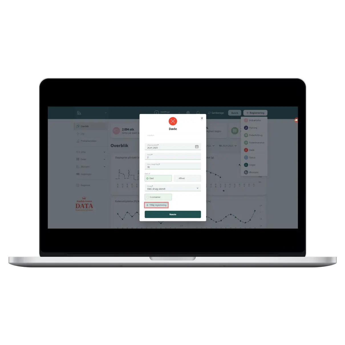 Når der registreres en død gris, er der kommet en knap i bunden af skærmen, som hedder ”Tilføj registrering”. Klikker brugeren på denne knap, er det muligt at taste flere døde grise i samme billede, uanset hvilken gård grisene kommer fra. Har man eksempelvis haft fire døde grise fra tre forskellige gårde, kan de altså tastes i én arbejdsgang via Danish Crown Data appen.