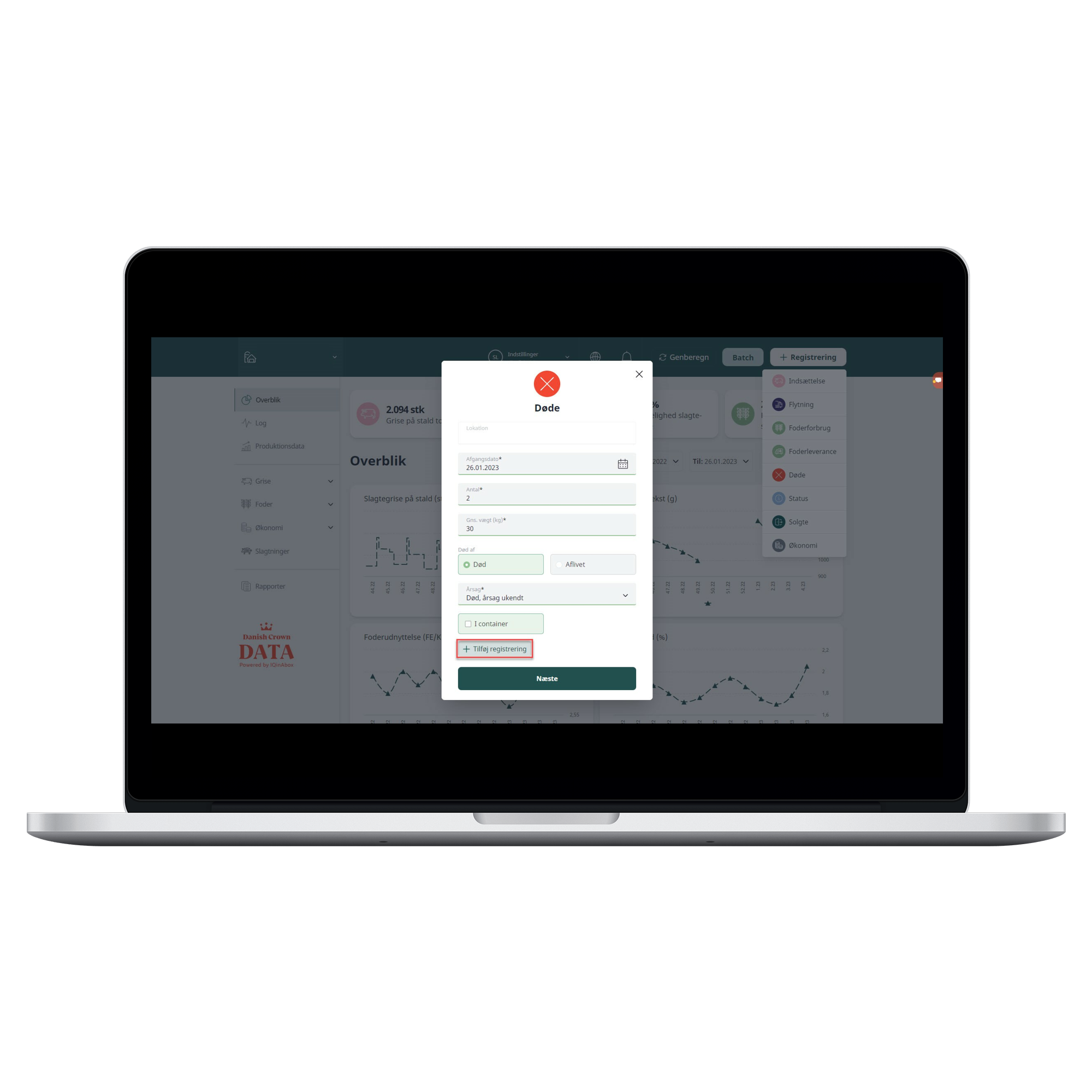 Når der registreres en død gris, er der kommet en knap i bunden af skærmen, som hedder ”Tilføj registrering”. Klikker brugeren på denne knap, er det muligt at taste flere døde grise i samme billede, uanset hvilken gård grisene kommer fra. Har man eksempelvis haft fire døde grise fra tre forskellige gårde, kan de altså tastes i én arbejdsgang via Danish Crown Data appen.