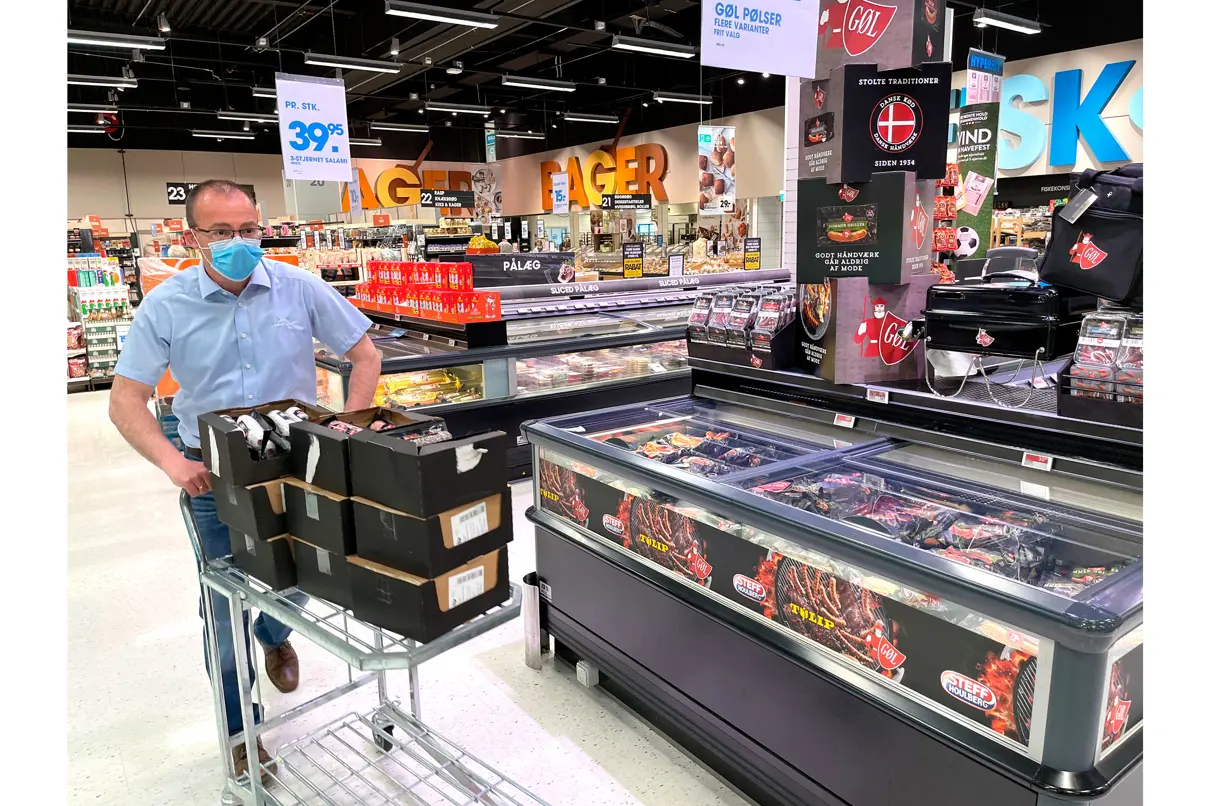Peter Serup Mouridsen er denne dag i gang med at pynte en endeboks op i Bilka i Randers, hvor det er Gøl-pølserne, der skal kæles for. Udstillingen rækker både bredt og op i luften, selve endeboksen er pyntet med klistermærker hele vejen rundt, og Gøl-pølserne er lagt snorlige, så de tager sig flot ud.